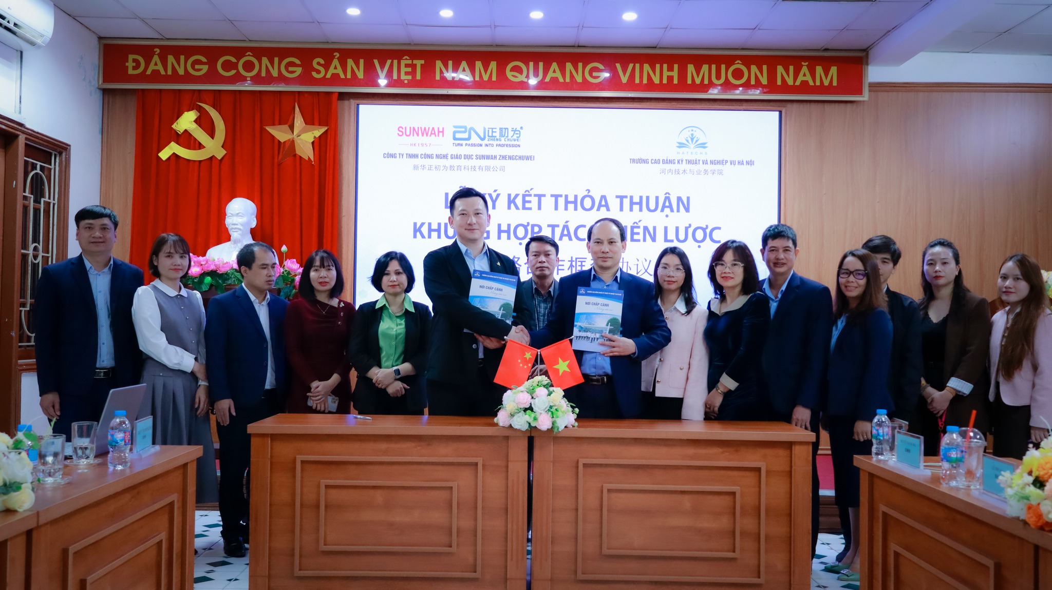 Trong buổi lễ ký kết, về phía trường Cao đẳng Kỹ thuật và Nghiệp vụ Hà Nội có TS. Lê Hồng Ngọc - Bí thư Đảng ủy - Hiệu trưởng nhà trường, đồng chí Trần Thanh Xuân Phó bí thư đảng ủy, Phó Hiệu trưởng Nhà trường cùng các đồng chí cán bộ quản lý các phòng, khoa liên quan. Về phía Công ty Công nghệ Giáo dục Sunwah - ZhengchuWei có ông Jayden Li - Tổng giám đốc, Bà Lê Thu Lụa trưởng đại diện tập đoàn Sunwah tại Hà Nội, bà Nguyễn Mai Hương - Giám đốc kinh doanh tập đoàn Sunwah Hà Nội.