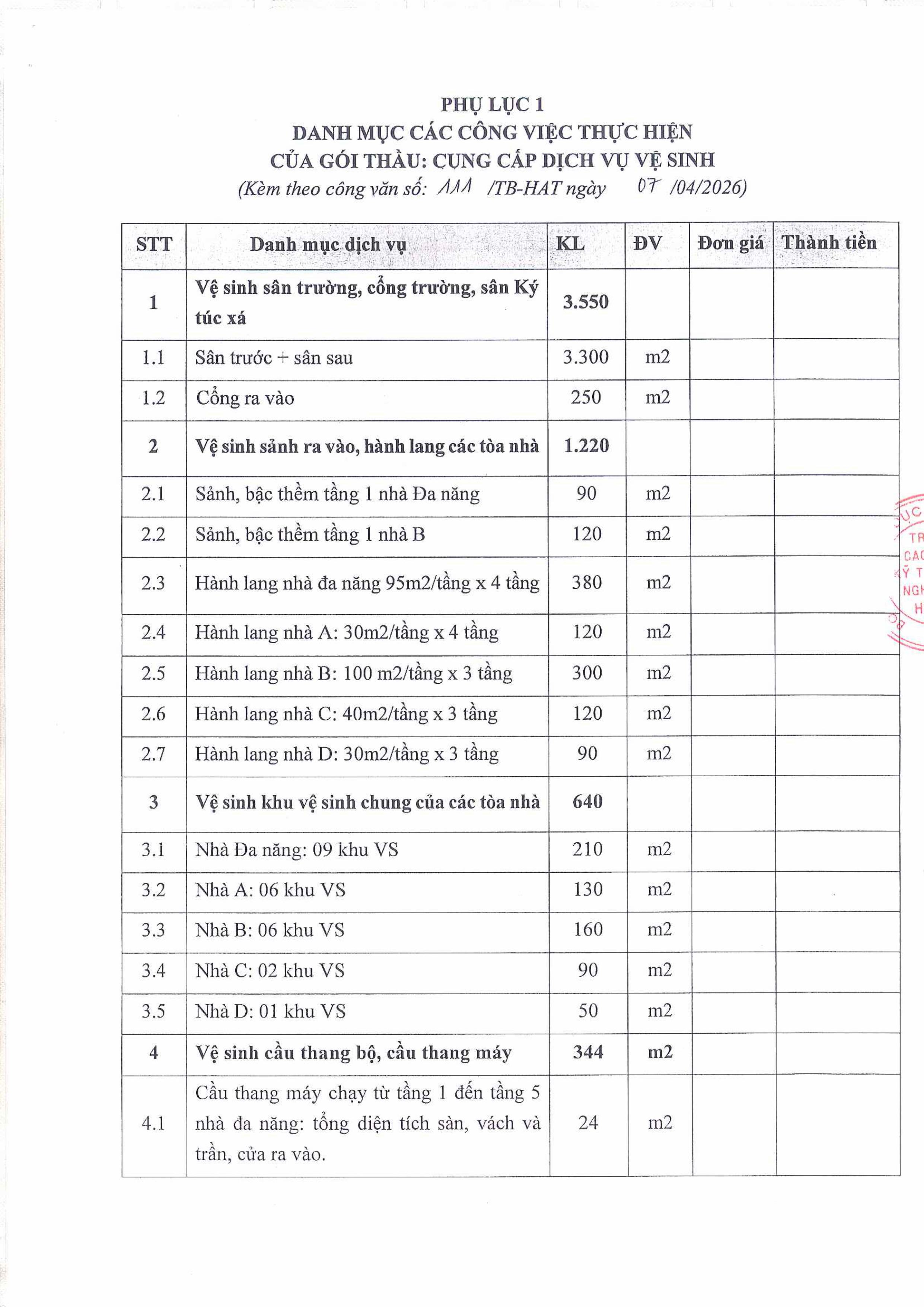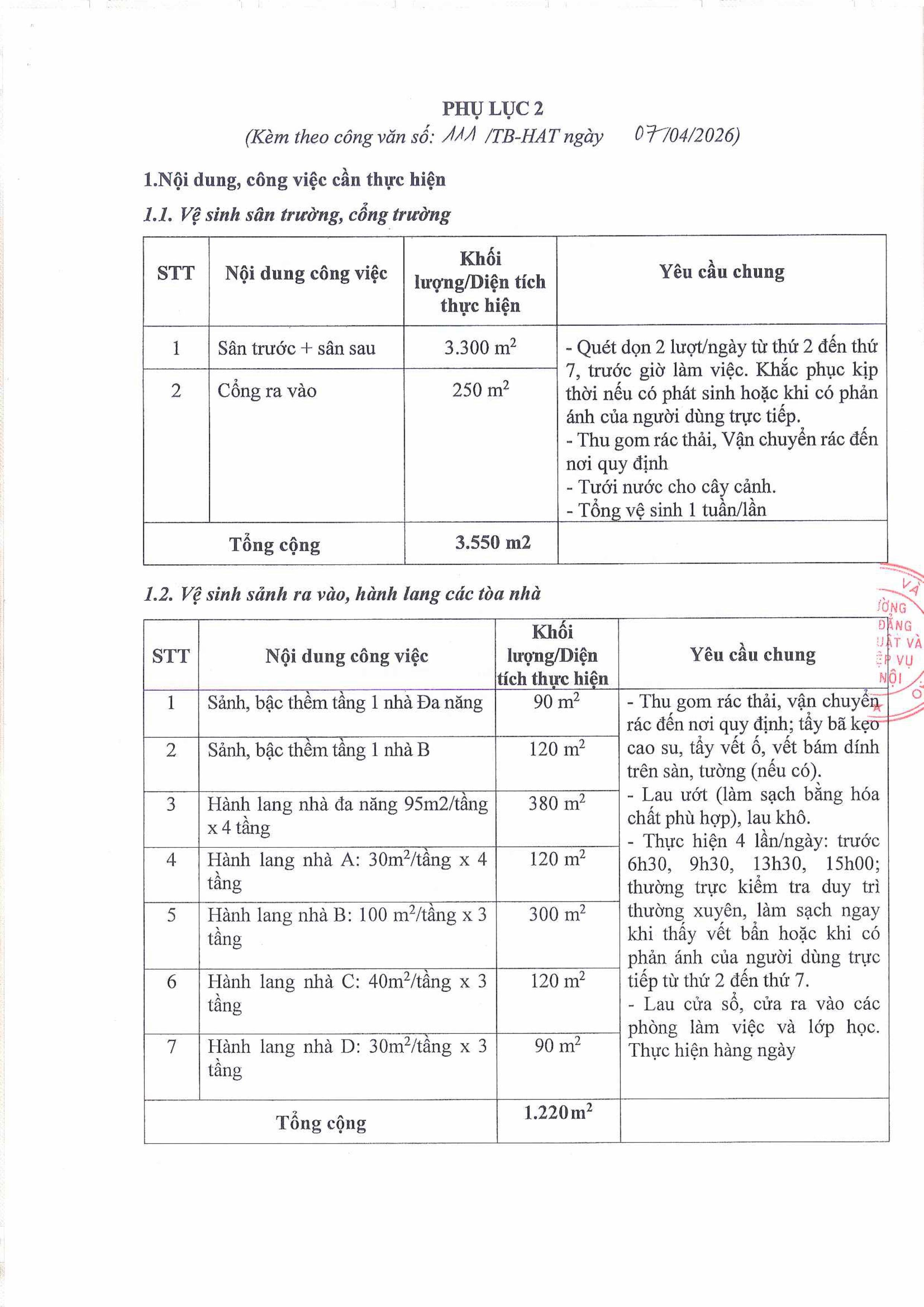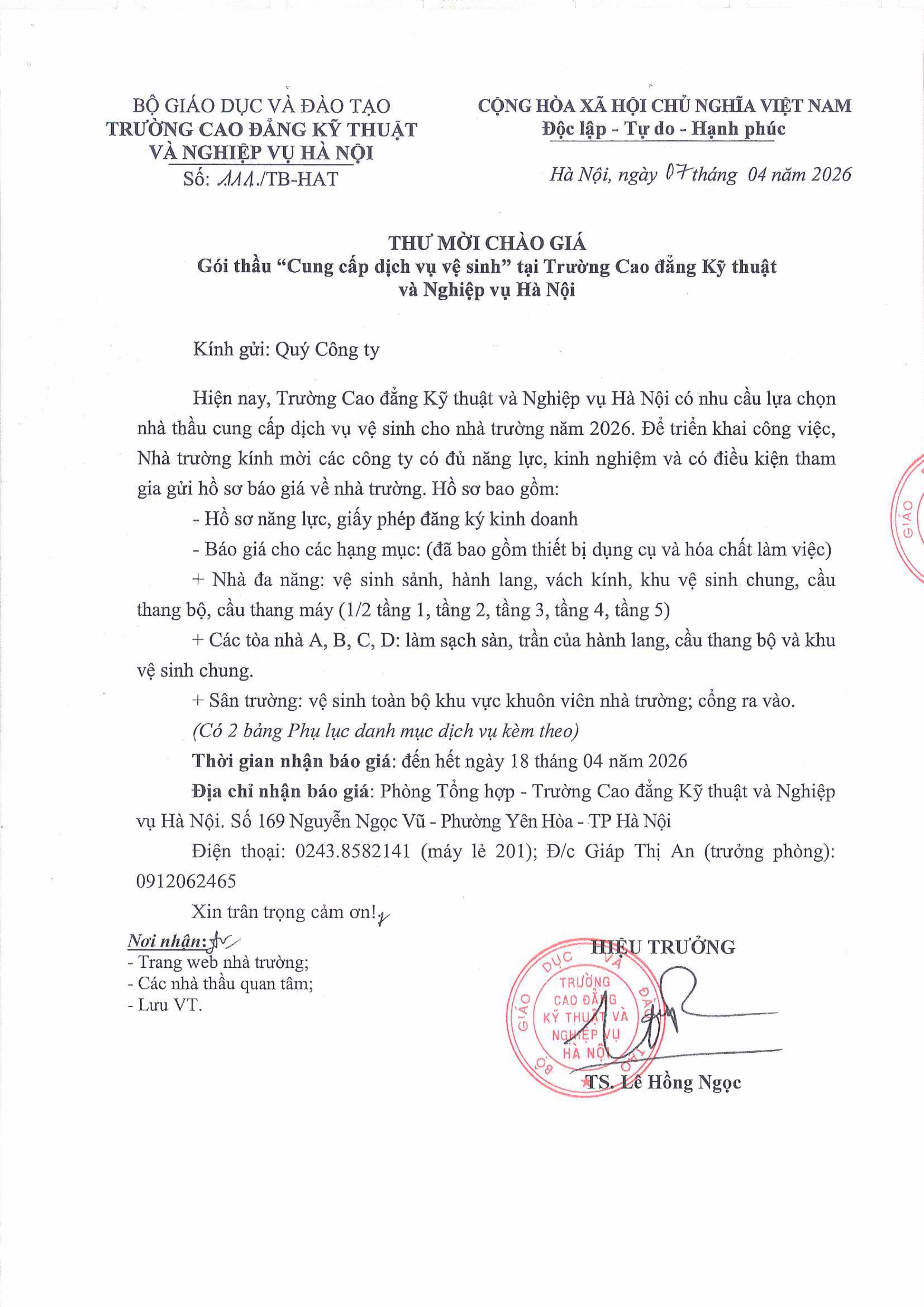 (Hatechs) Thư mời chào giá gói thầu "Cung cấp dịch vụ vệ sinh" tại trường Cao đẳng Kỹ thuật nghiệp vụ Hà Nội