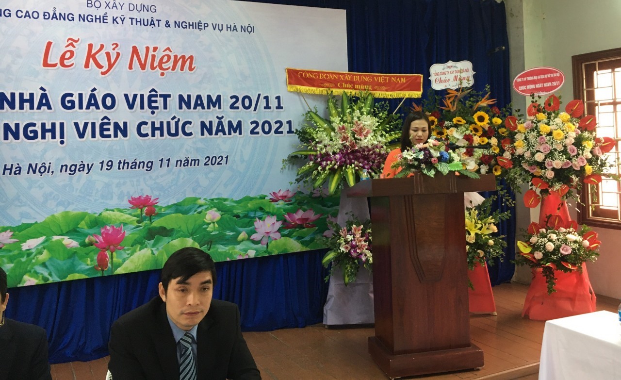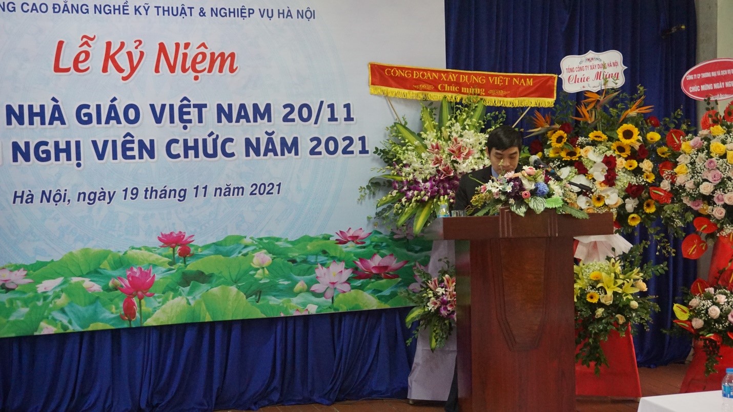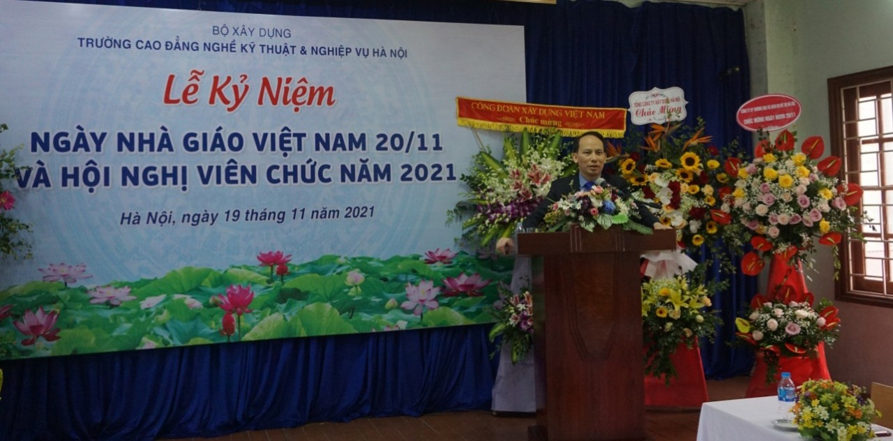 Phát biểu, động viên và chia sẻ tại Hội nghị, đồng chí Phạm Xuân Hải, Phó chủ tịch Công đoàn Xây Dựng Việt Nam gửi lời chúc mừng đến toàn thể cán bộ, giáo viên, công nhân viên Nhà trường nhân ngày 20./11. Đồng chí ghi nhận và biểu dương trước những kết quả đạt được của Nhà trường trong năm 2021. Mặc dù năm 2021 là một năm đầy khó khăn và thách thức trong công tác đào tạo, tuyển sinh. Song, vượt lên những khó khăn đó, Ban giám hiệu cùng cán bộ công nhân viên nhà trường đã đạt được những thành tích vượt bậc. Qua đó thể hiện sự nỗ lực, đồng lòng, tâm huyết của tập thể cán bộ trường Cao đẳng nghề Kỹ thuật và Nghiệp vụ Hà Nội.