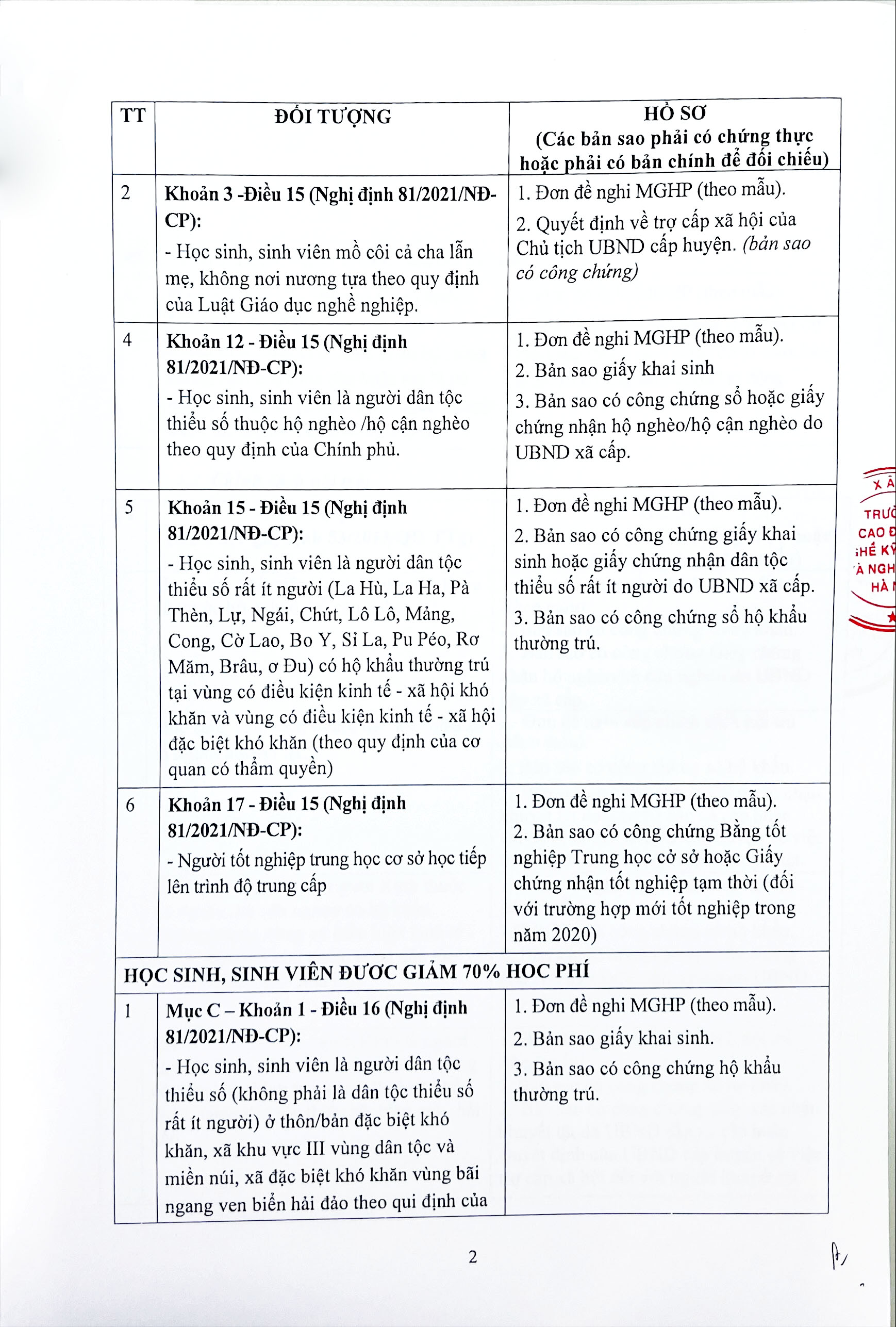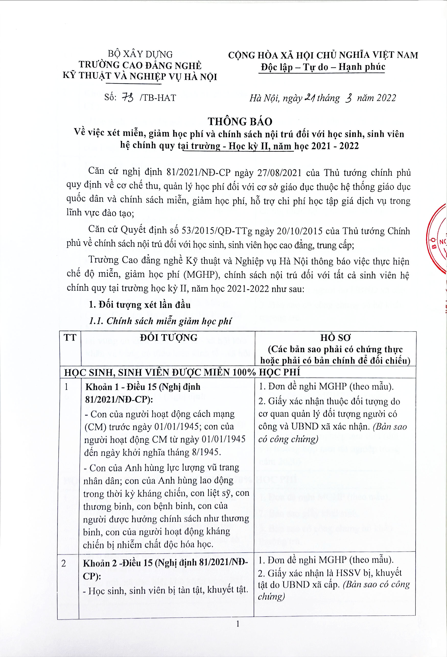 Trường Cao đẳng nghề Kỹ thuật và Nghiệp vụ Hà Nội thông báo việc thực hiện chế độ miễn, giảm học phí (MGHP), chính sách nội trú đối với tất cả sinh viên hệ chính quy tại trường học kỳ II, năm học 2021-2022 như sau: