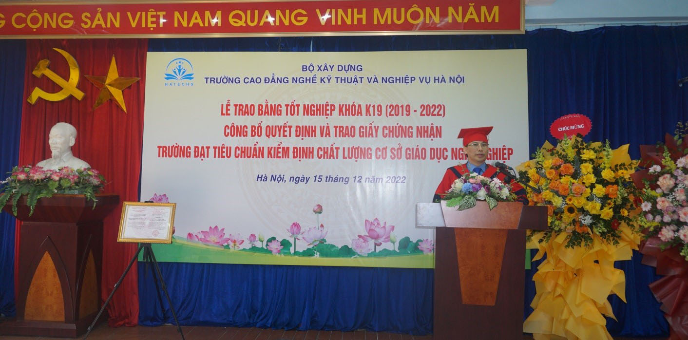 Thay mặt ban lãnh đạo Nhà trường thầy Lê Hồng Ngọc đã gửi lời cảm ơn tới ban lãnh đạo Công ty cổ phần kiểm định và tư vấn Giáo dục Việt Nam, cảm ơn đoàn kiểm định viên trong quá trình làm việc tại Trường đã trao đổi cởi mở với cán bộ giảng viên Nhà trường, làm việc khách quan, công tâm. Trong buổi lễ trang trọng, Thầy Hiệu trưởng nhiệt liệt chúc mừng các tân kỹ sư, tân cử nhân đã hoàn thành chương trình đào tạo và được công nhận tốt nghiệp tại trường năm 2022. Thầy đã biểu dương và cảm ơn toàn thể cán bộ, giảng viên công nhân viên Nhà trường đã nỗ lực vượt qua khó khăn để hoàn thành nhiệm vụ, đồng thời Thầy cũng gửi lời tri ân, lời cảm ơn tới các bậc phụ huynh, tới các tổ chức, các doanh nghiệp và toàn thể các tân kỹ sư, cử nhân đã tin tưởng và hợp tác với Nhà trường để cùng đạt được kết quả như ngày hôm nay.