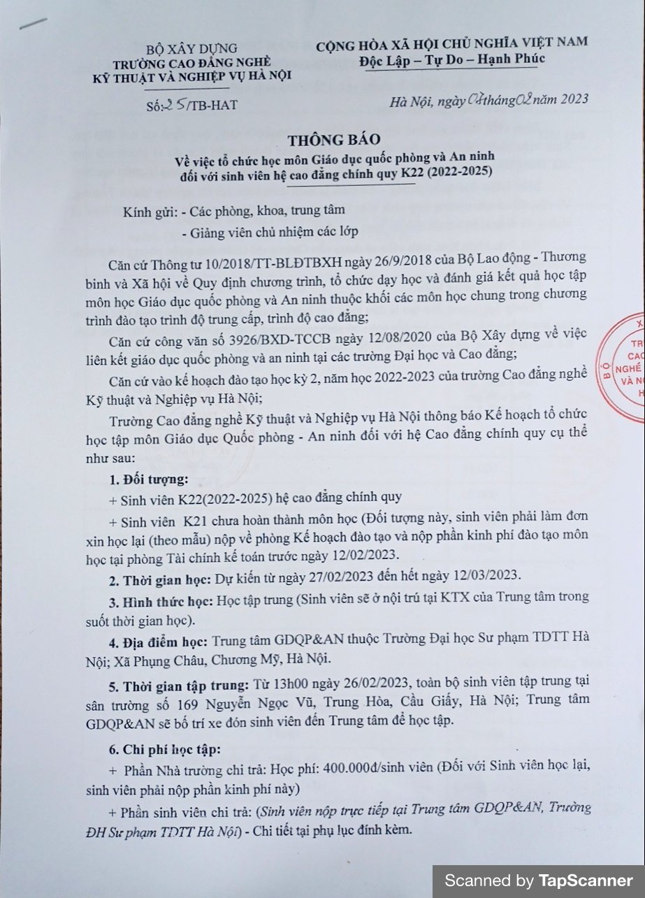 Thông báo tổ chức học môn giáo dục quốc phòng và an ninh đối với sinh viên hệ cao đẳng chính quy K22 (2022-2025)
