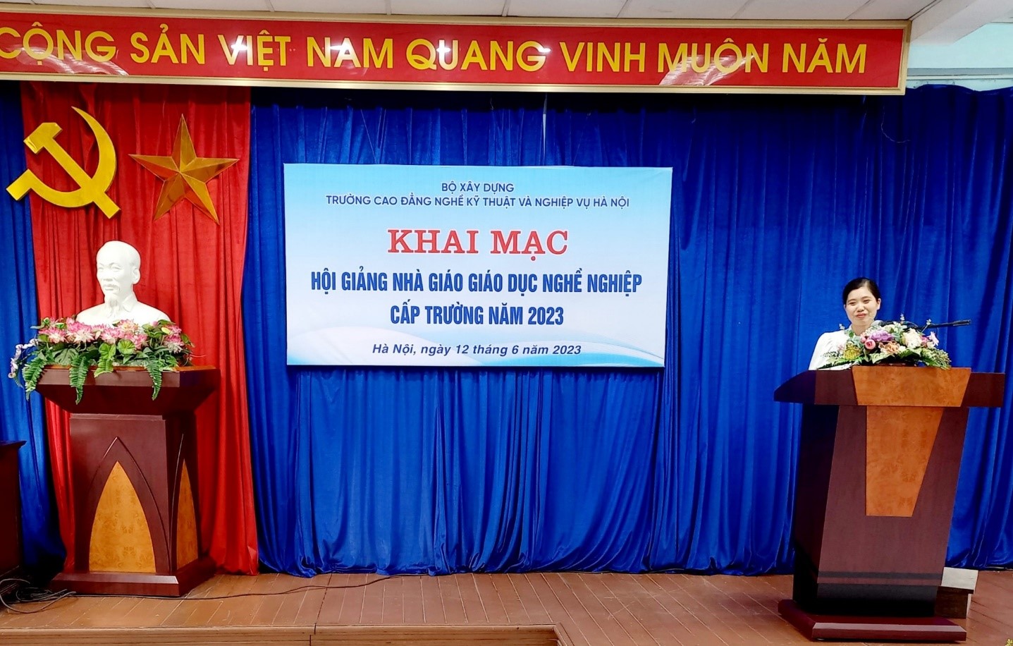 Cô Nguyễn Thị Thu Hiền - giảng viên khoa Kinh tế đại diện cho các nhà giáo tham gia Hội giảng hứa với lãnh đạo Nhà trường cùng tập thể các nhà giáo của Nhà trường, sẽ mang hết nhiệt huyết, khả năng và sự sáng tạo vào trong bài giảng để góp phần đưa hội giảng năm 2023 của Nhà trường thành công rực rỡ, qua đó góp phần làm phong phú phương pháp, kỹ năng giảng dạy trong toàn trường.
