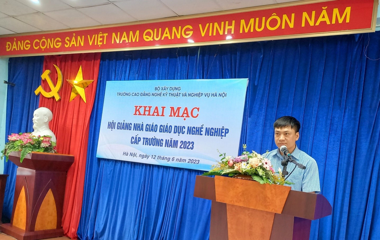 Thầy Lê Hồng Ngọc - Bí thư Đảng uỷ, Hiệu trưởng Nhà trường phát biểu Khai mạc Hội giảng