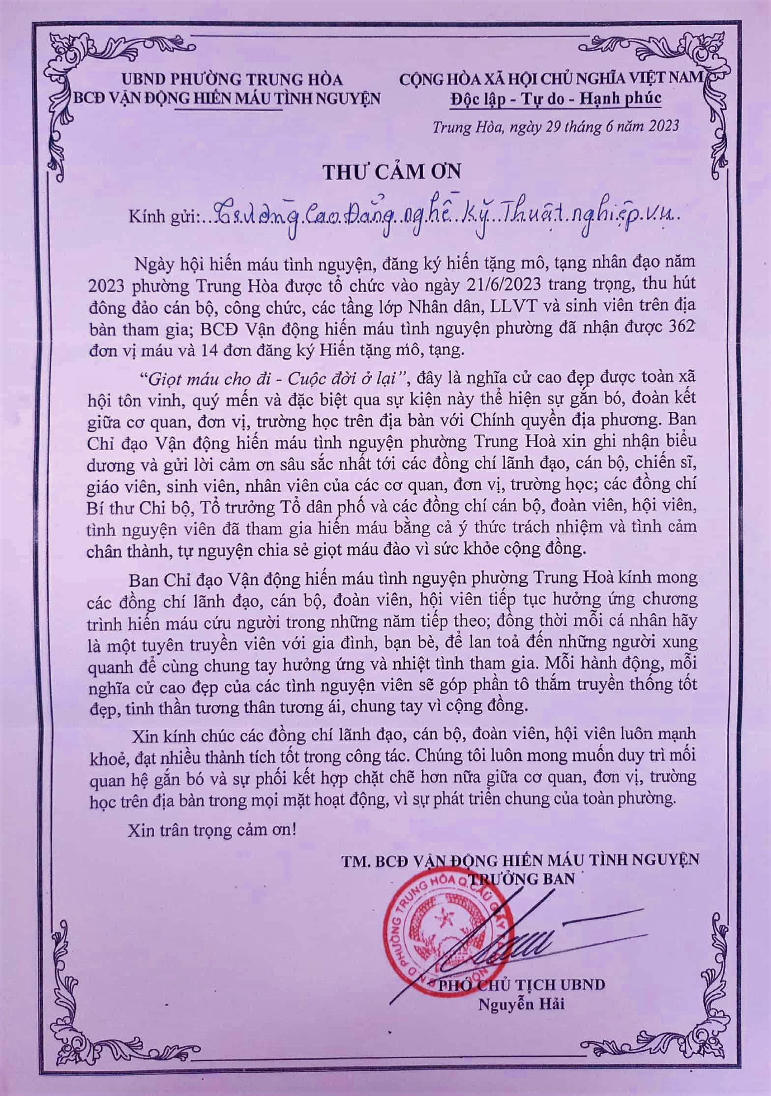 Ghi nhận và biểu dương những đóng góp mang tính nhân văn cao cả của cán bộ, giáo viên và sinh viên nhà trường, Ban chỉ đạo vận động hiến máu tình nguyện phường Trung Hòa gửi thư cảm ơn đội ngũ cán bộ, giáo viên, sinh viên nhà trường đã tham gia hiến máu bằng cả ý thức trách nhiệm và tình cảm chân thành, tự nguyện chia sẻ giọt máu đào vì sức khỏe cộng đồng.