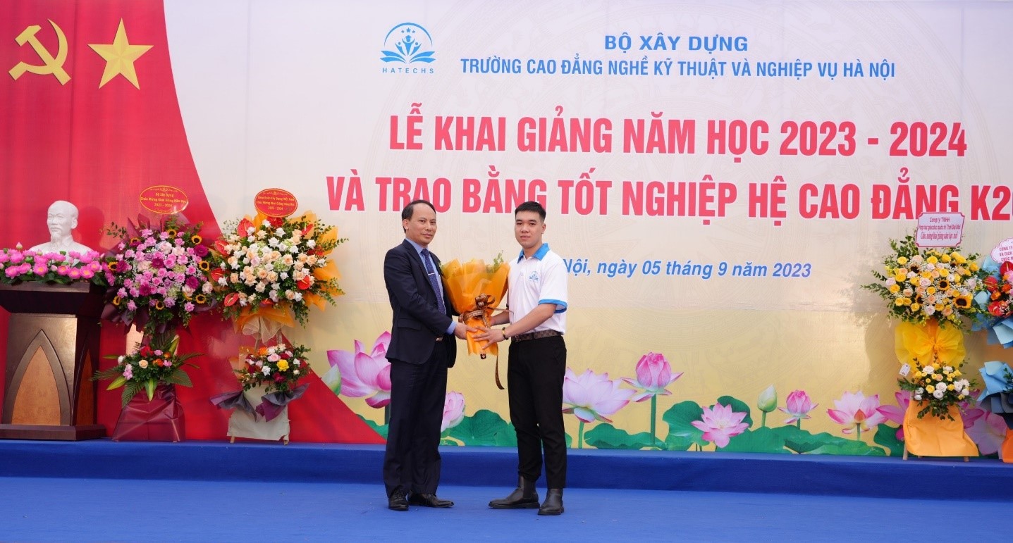 Thay mặt cho các bạn sinh viên Cao đẳng khóa K20 nhận bằng tốt nghiệp trong buổi lễ ngày hôm nay, em Lê Quang Huy - sinh viên lớp Công nghệ ô tô đã gửi tặng Nhà trường bó hoa tươi thắm và bày tỏ sự tri ân sâu sắc tới ban lãnh đạo cùng toàn thể cán bộ công nhân viên chức nhà trường. Tự hào là sinh viên của Trường Cao đẳng nghề Kỹ thuật và Nghiệp vụ Hà Nội, Huy và các bạn cũng thể hiện lòng quyết tâm, hứa sẽ tiếp tục phấn đấu, mang kiến thức kỹ năng chuyên môn đã được học tập vận dụng sáng tạo vào công việc và cuộc sống, khẳng định giá trị bản thân, xứng đáng là sinh viên của nhà trường.
