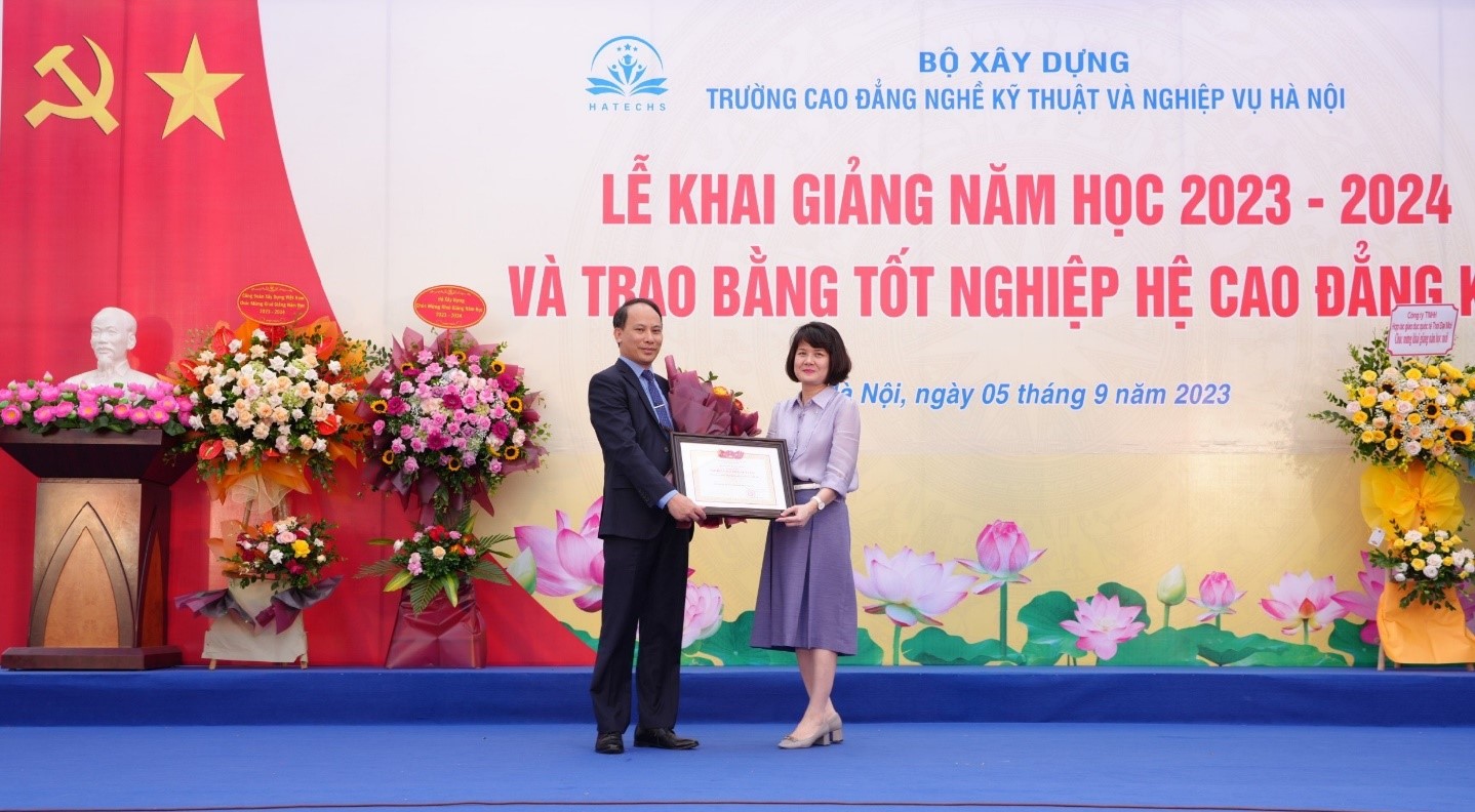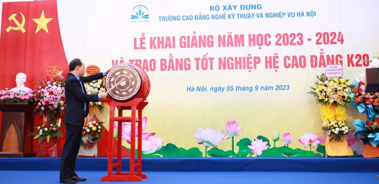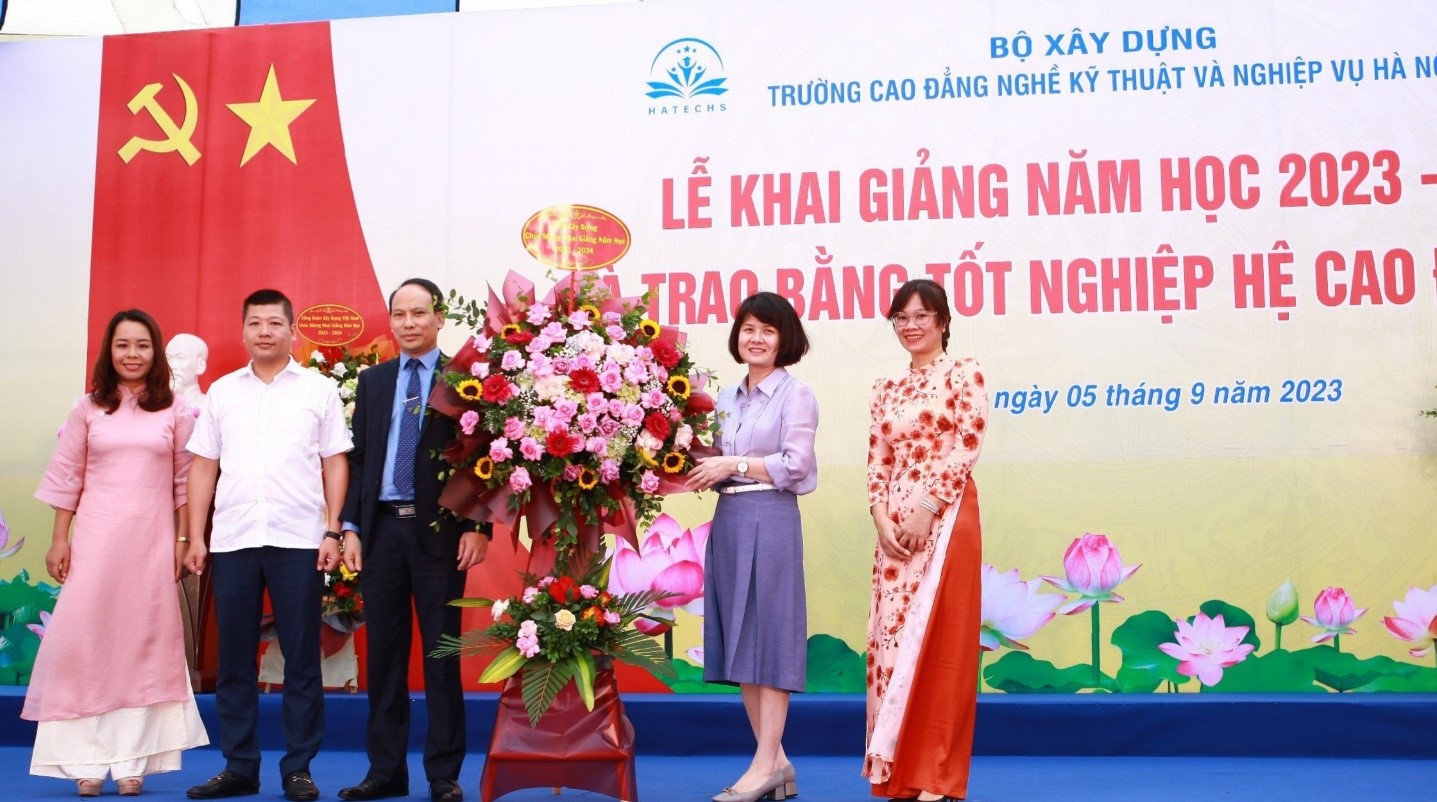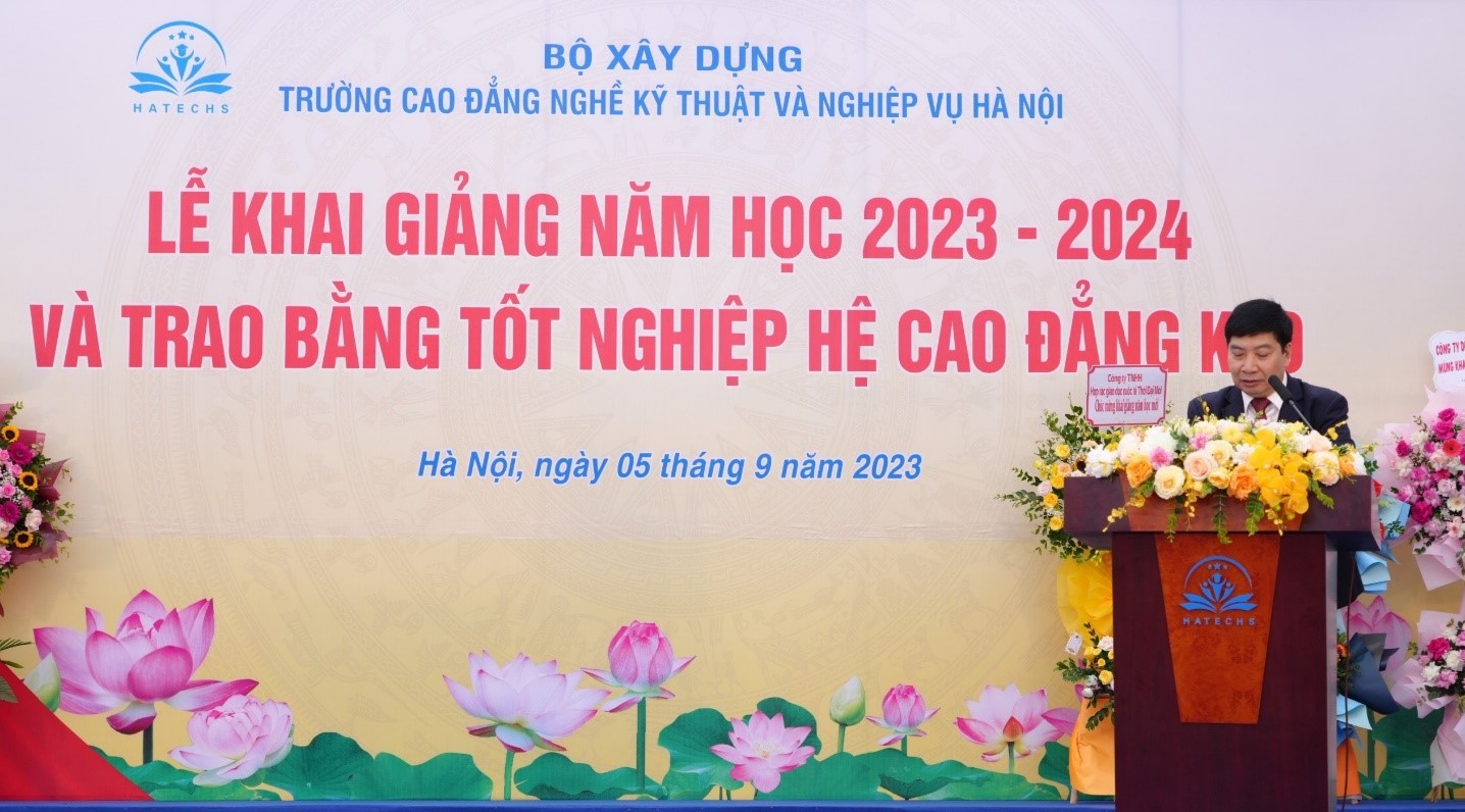 Tới dự lễ khai giảng năm học 2023-2024 và trao bằng tốt nghiệp cho sinh viên Cao đẳng khóa K20, đồng chí Phạm Xuân Hảỉ - phó Chủ tịch Công đoàn Xây dựng Việt Nam đã ghi nhận và biểu dương những kết quả mà Trường Cao đẳng nghề Kỹ thuật và Nghiệp vụ Hà Nội đạt được trong năm học vừa qua. Đồng chí nhấn mạnh rằng, cá nhân đồng chí cũng như các đồng chí lãnh đạo Bộ Xây dựng rất vui và tự hào về những đóng góp của nhà trường trong lĩnh vực đào tạo nghề, góp phần cung cấp nguồn nhân lực chất lượng cao cho ngành xây dựng cũng như đất nước trong suốt hơn 60 năm qua. Trên cơ sở những kết quả đã đạt được, đồng chí mong rằng, trong thời gian tới, Nhà trường cần tiếp tục giữ vững thành tích, đổi mới sáng tạo, nâng cao hiệu quả, quy mô công tác tuyển sinh, để không ngừng nâng cao vị thế, uy tín, thương hiệu và đáp ứng yêu cầu của người học, đưa nhà trường ngày càng phát triển bền vững.