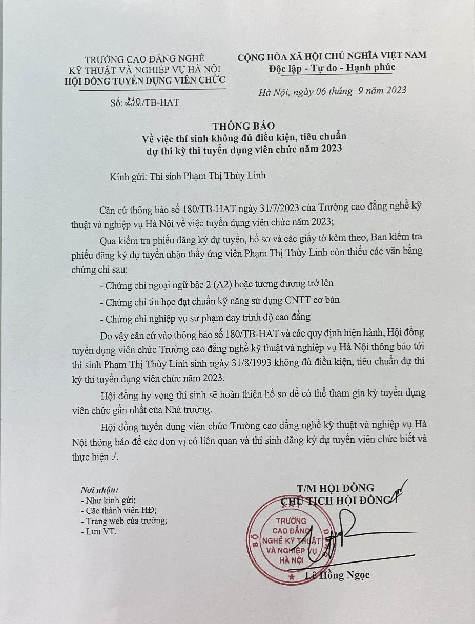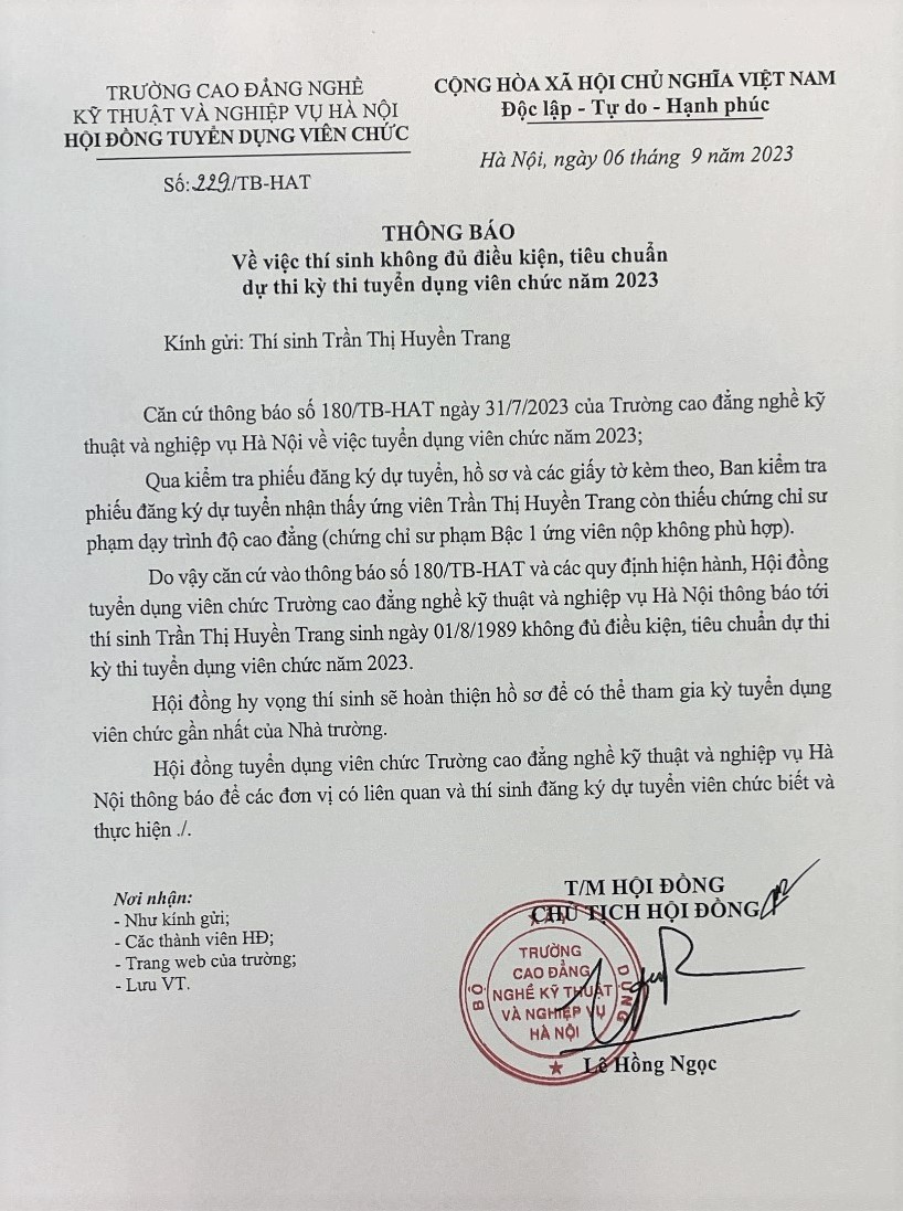 (Hatechs) Căn cứ Báo cáo kết quả kiểm tra phiếu đăng ký dự tuyển, hồ sơ thí sinh dự thi kỳ tuyển dụng viên chức năm 2023 của Ban kiểm tra phiếu dăng ký dự tuyển; Hội đồng tuyển dụng viên chức trường Cao đẳng nghề kỹ thuật và nghiệp vụ Hà Nội thông báo cho các thí sinh không đủ điều kiện, tiêu chuẩn dự kỳ thi tuyển sụng viên chức năm 2023 cụ thể như sau: