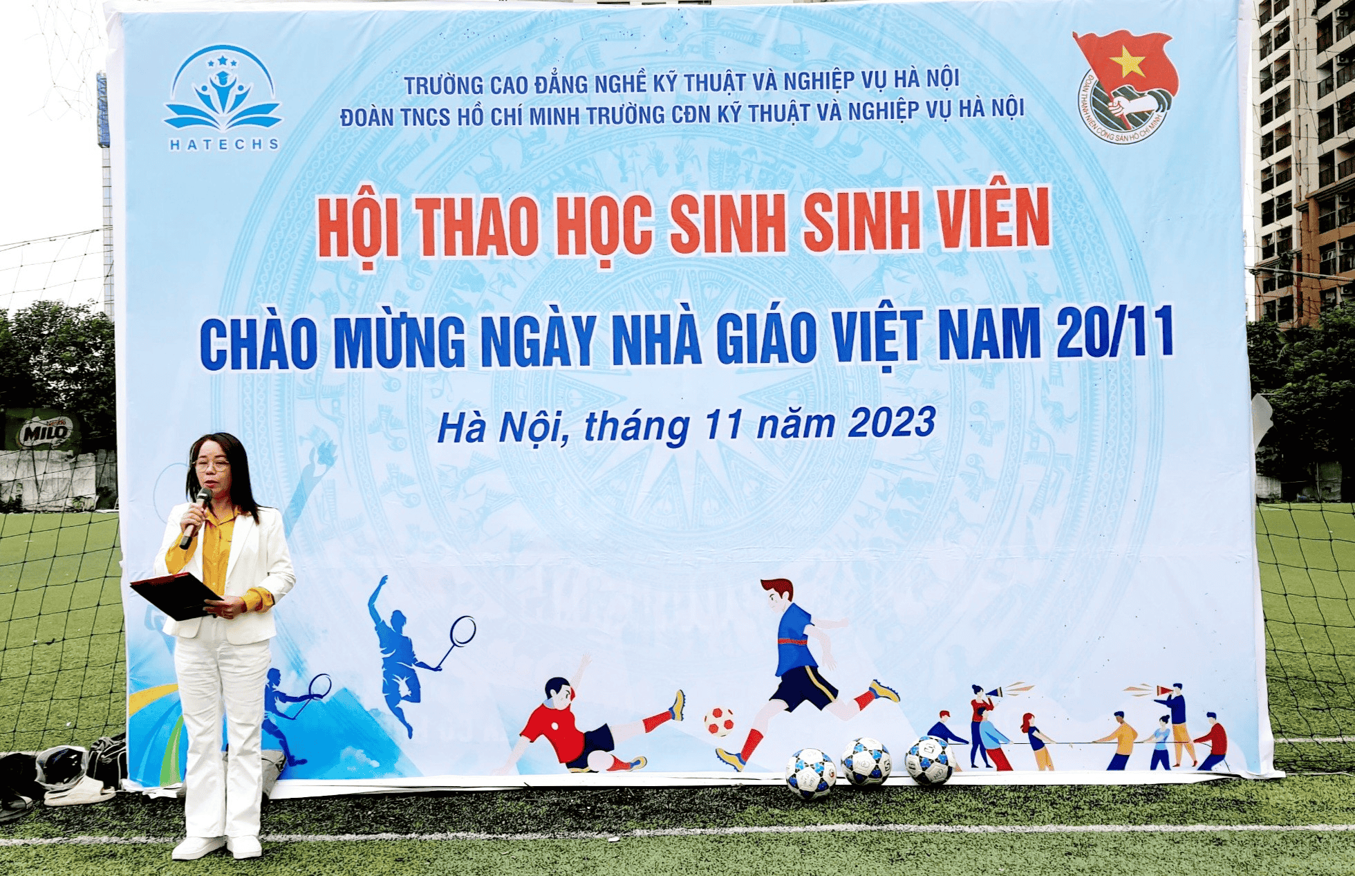Thay mặt Ban lãnh đạo nhà trường, Cô Phạm Thị Phượng đã phát biểu chỉ đạo, động viên tinh thần các vận động viên cũng như khuyến khích học sinh, sinh viên Nhà trường tham gia các hoạt động thể dục thể thao. Cô nhấn mạnh: “Ngoài những thành tích đã đạt được trong lĩnh vực dạy và học, hằng năm nhà trường thường xuyên tổ chức ngày hội văn nghệ, thể dục thể thao trong toàn trường, qua đó kịp thời biểu dương, động viên phong trào khỏe để lao động và học tập ở các lớp, góp phần xây dựng Trường Cao đẳng nghề Kỹ thuật và Nghiệp vụ Hà Nội thực sự là ngôi trường thân thiện, học sinh sinh viên tích cực”. Cô cũng gửi lời chúc các vận động viên có một giải đấu hết mình để Hội thao Nhà trường mãi luôn là một kỷ niệm đẹp trong thời sinh viên của các em.