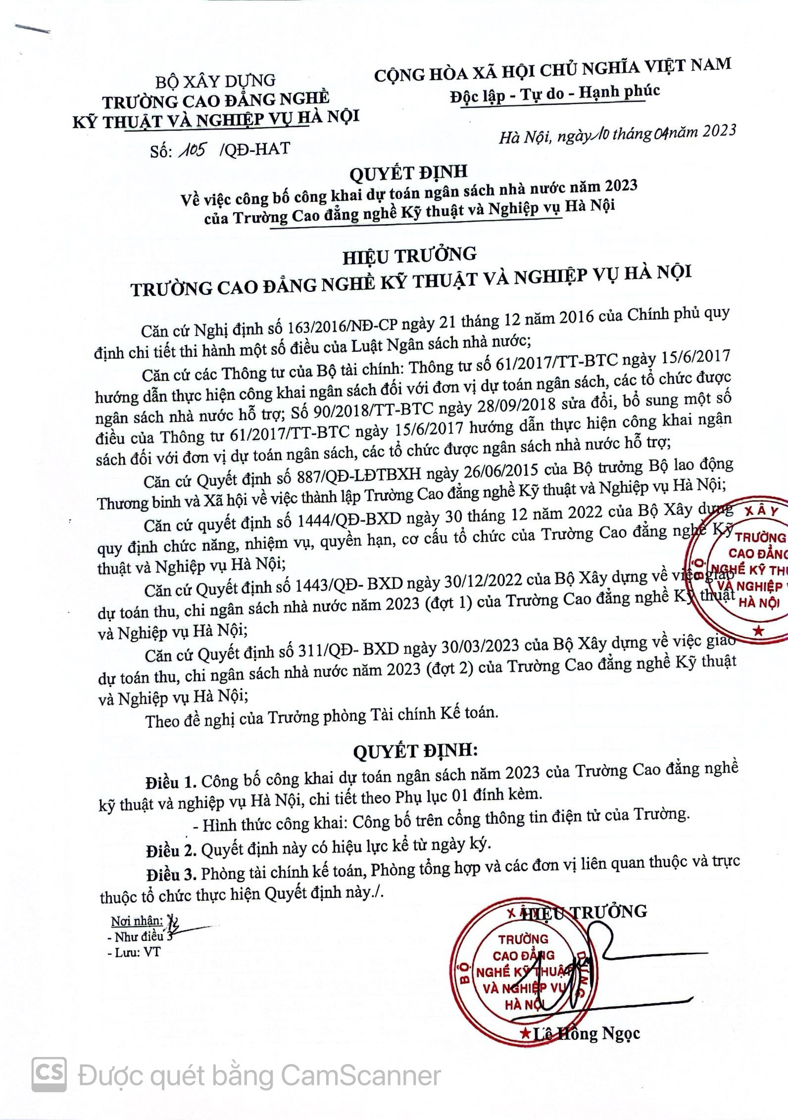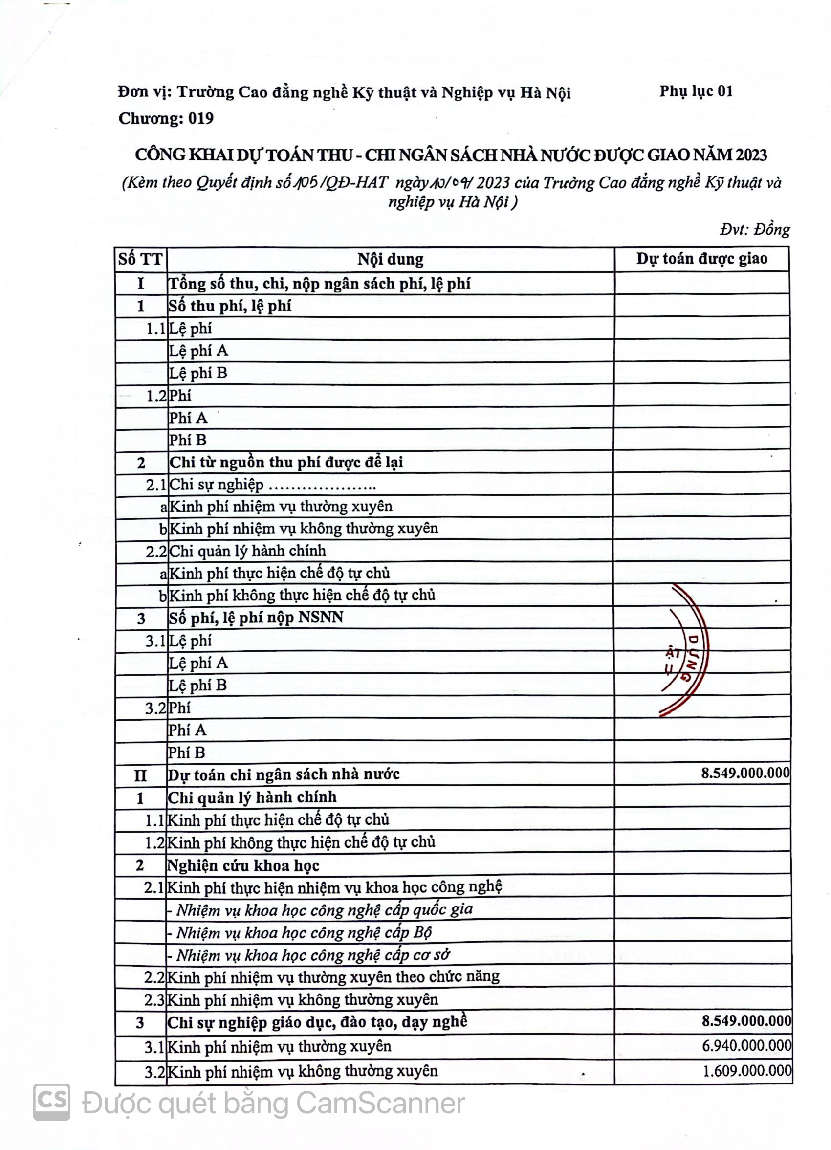 Công khai dự toán ngân sách năm 2023 của trường Cao đẳng kỹ thuật và nghiệp vụ Hà Nội