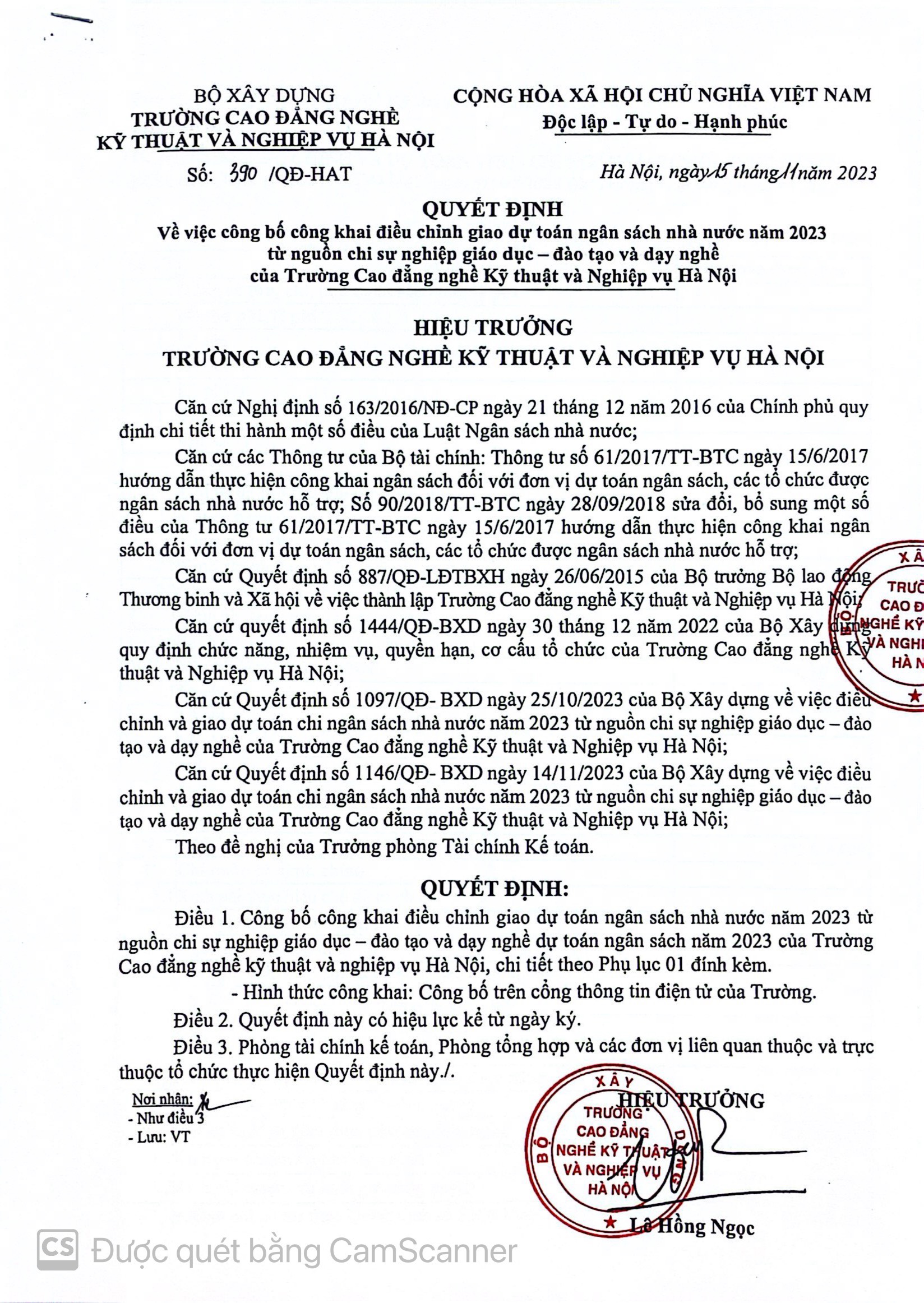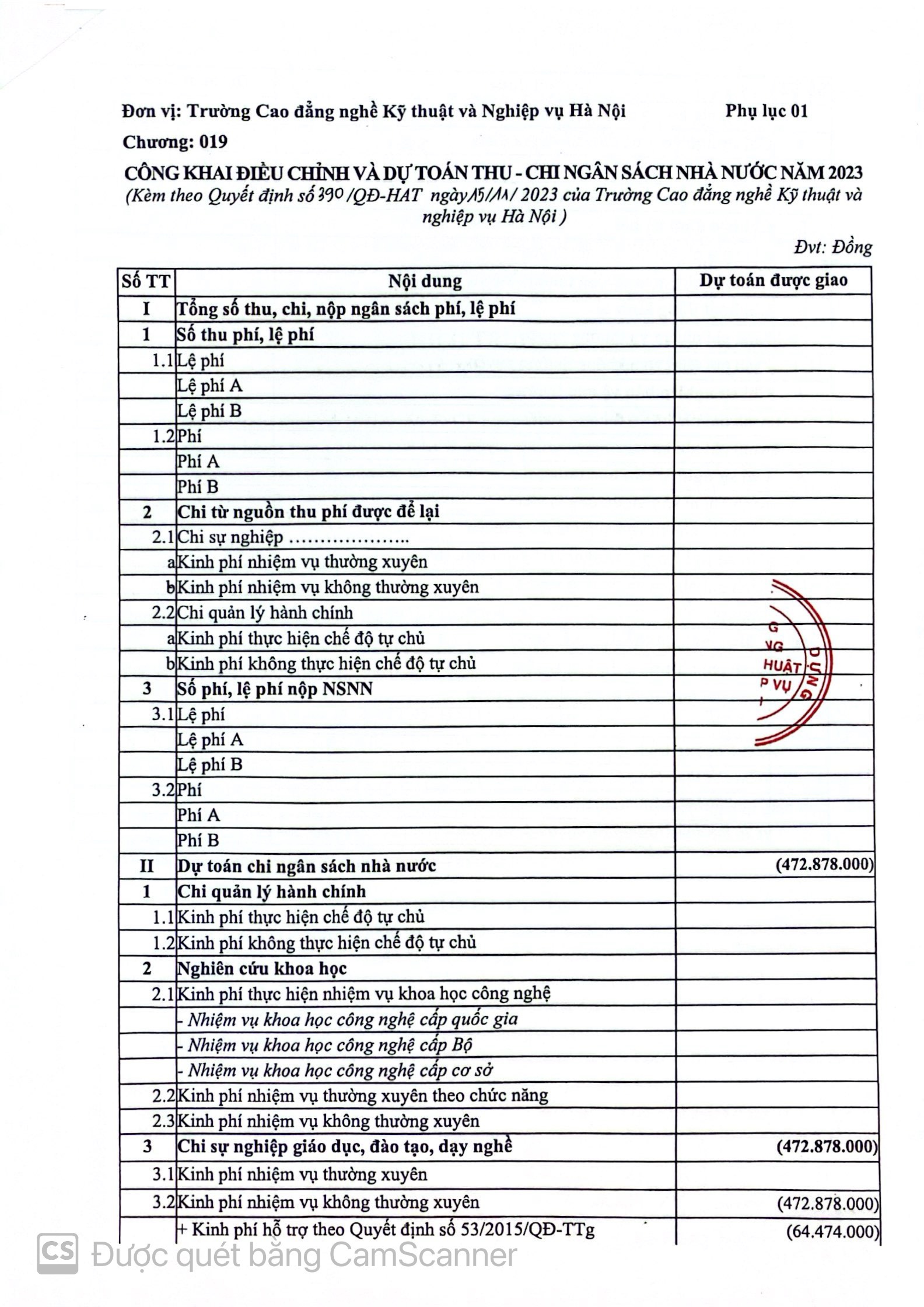 Công khai điều chỉnh dự toán ngân sách nhà nước năm 2023 của trường Cao đẳng nghề Kỹ thuật và nghiệp vụ Hà Nội