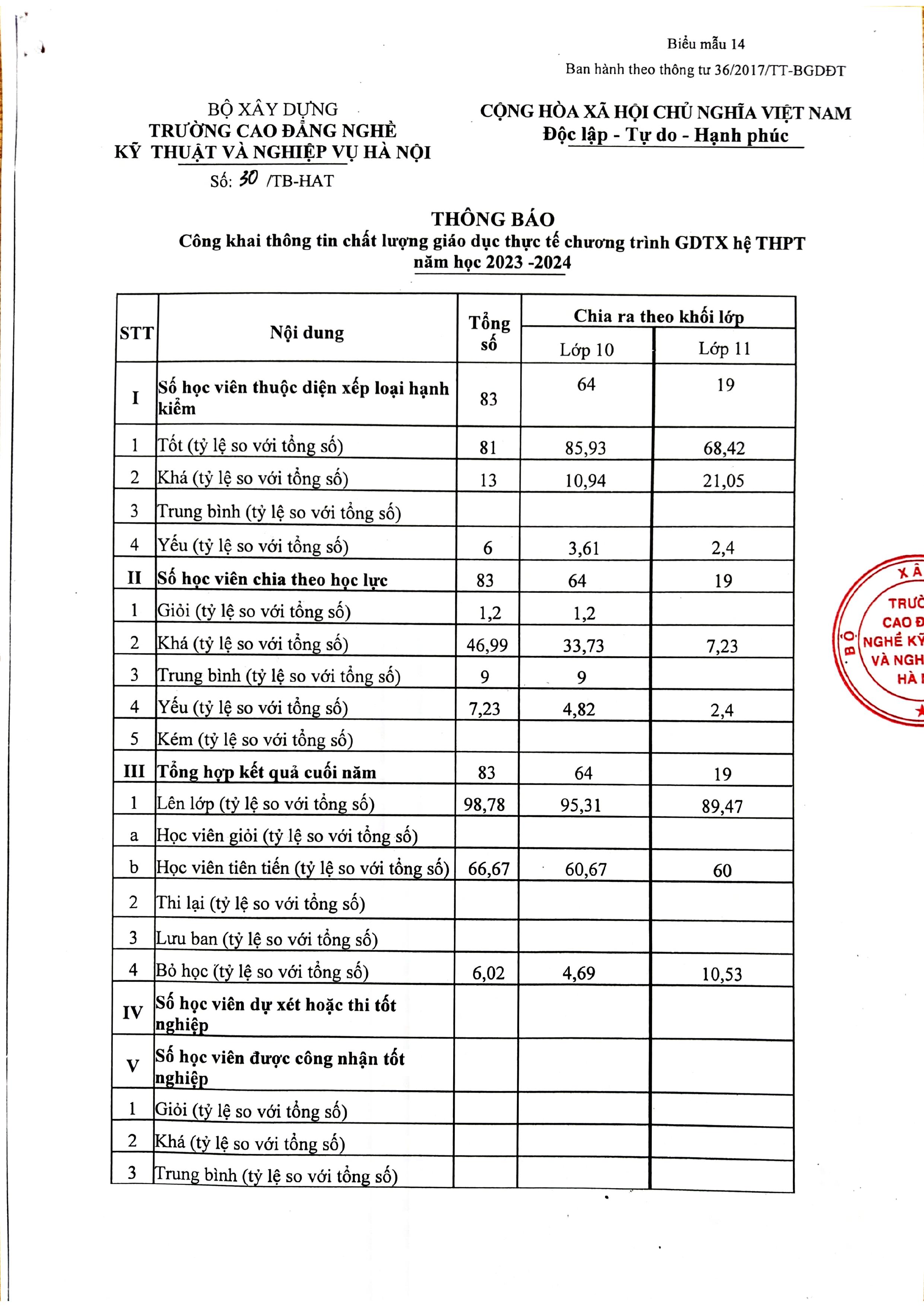 (Hatechs) Công khai thông tin chất lượng giáo dục thực tế chương trình GDTX hệ THPT năm học 2023-2024