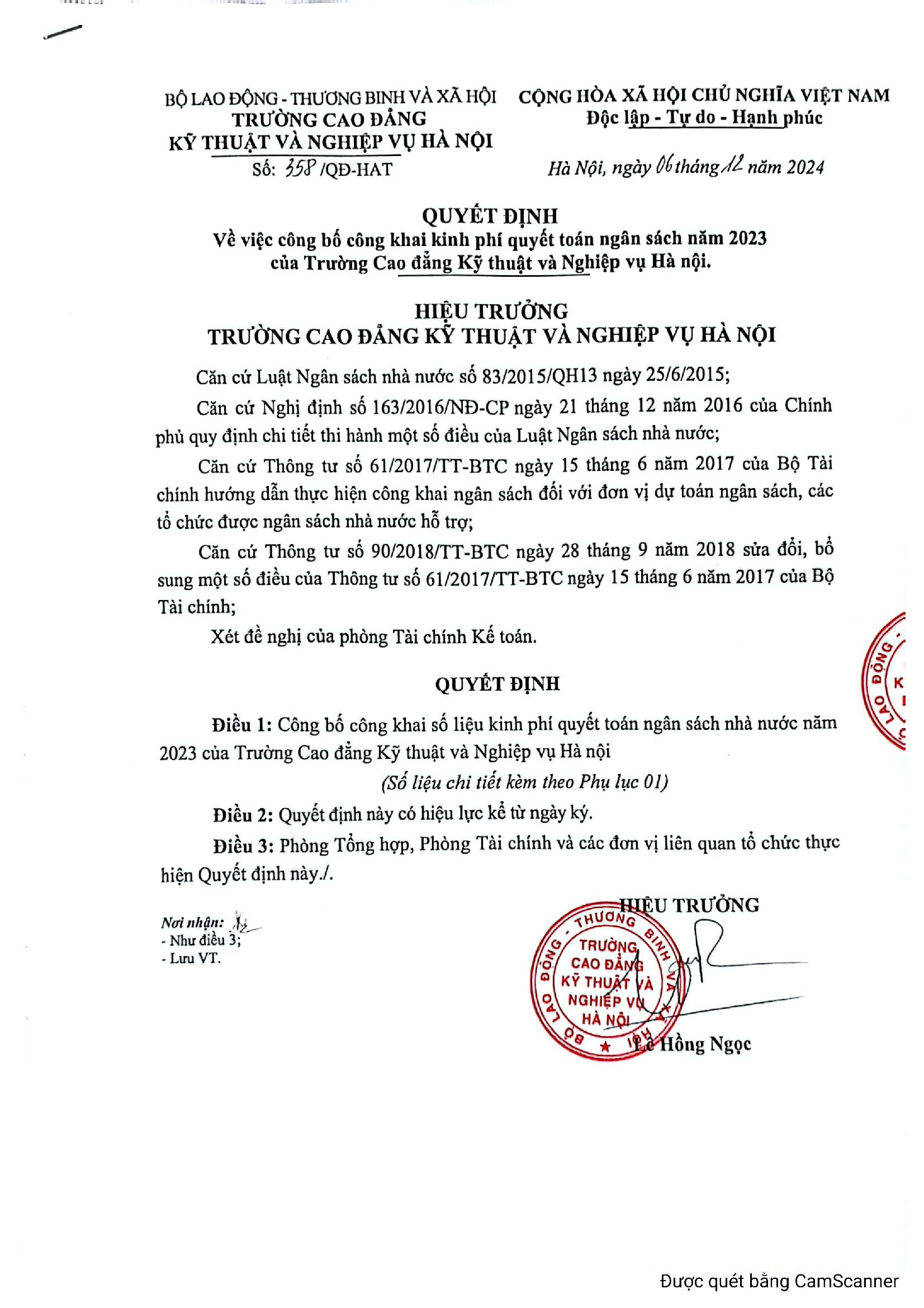 Công khai kinh phí quyết toán ngân sách nhà nước năm 2023 của trường Cao đẳng Kỹ thuật và nghiệp vụ Hà Nội