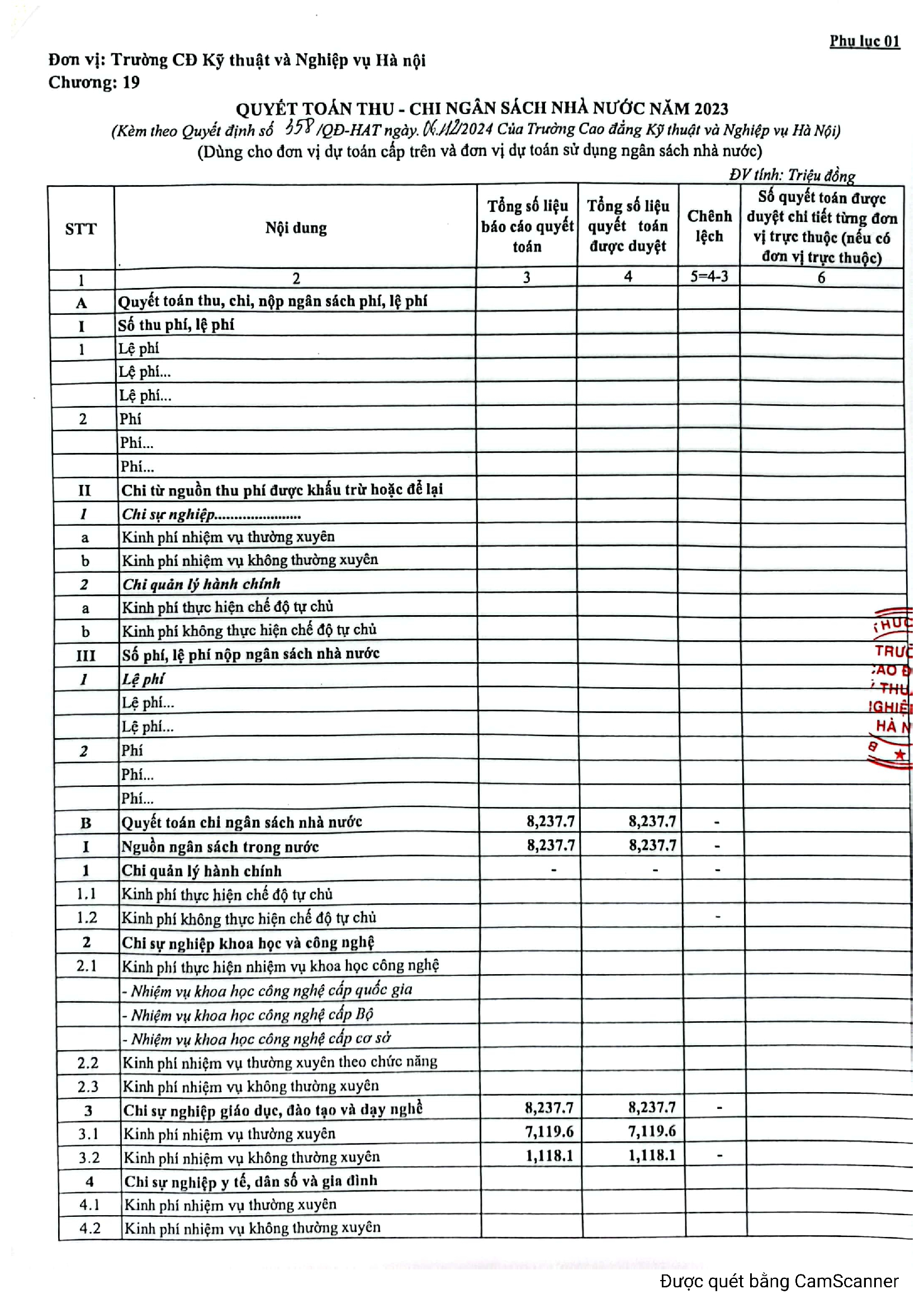 (Hatechs) Công khai quyết toán ngân sách nhà nước năm 2023 của trường Cao đẳng Kỹ thuật và nghiệp vụ Hà Nội