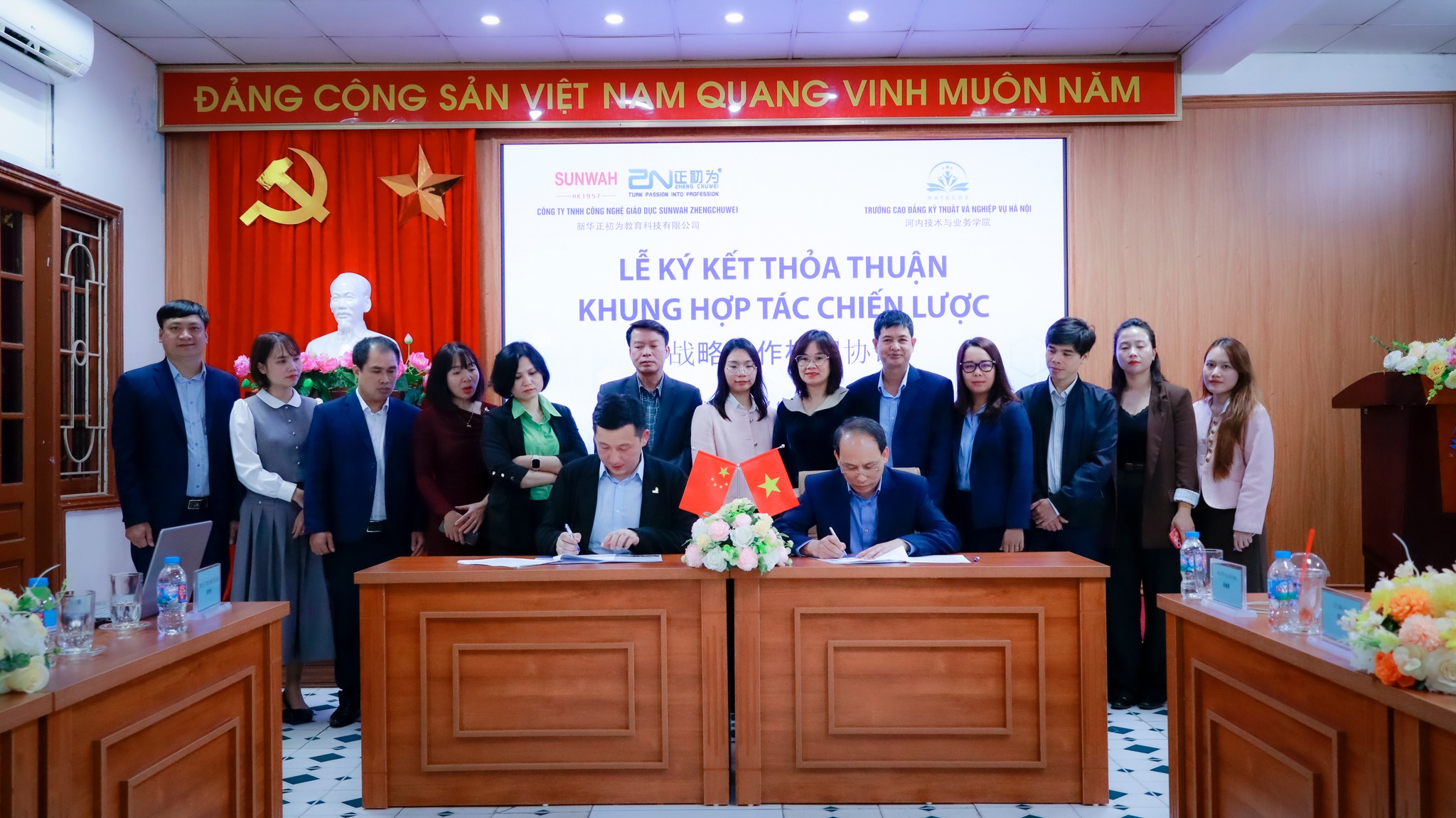 Trong buổi lễ ký kết, về phía trường Cao đẳng Kỹ thuật và Nghiệp vụ Hà Nội có TS. Lê Hồng Ngọc - Bí thư Đảng ủy - Hiệu trưởng nhà trường, đồng chí Trần Thanh Xuân Phó bí thư đảng ủy, Phó Hiệu trưởng Nhà trường cùng các đồng chí cán bộ quản lý các phòng, khoa liên quan. Về phía Công ty Công nghệ Giáo dục Sunwah - ZhengchuWei có ông Jayden Li - Tổng giám đốc, Bà Lê Thu Lụa trưởng đại diện tập đoàn Sunwah tại Hà Nội, bà Nguyễn Mai Hương - Giám đốc kinh doanh tập đoàn Sunwah Hà Nội.