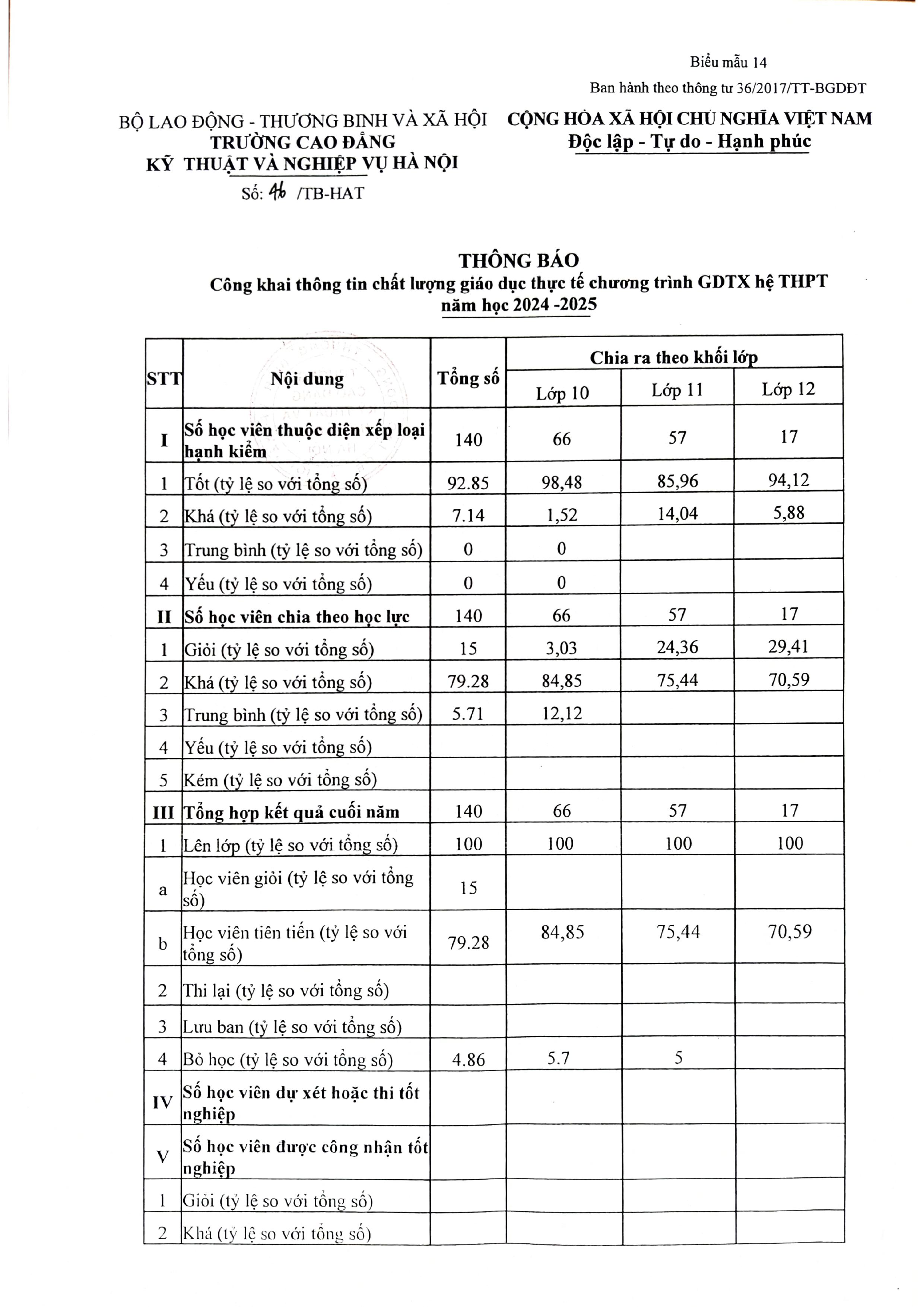 (Hatechs) Công khai thông tin chất lượng giáo dục thực tế chương trình GDTX hệ THPT năm học 2024-2025
