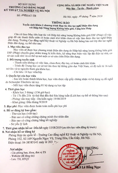 Tuyển sinh Khóa 2 chương trình Hợp tác đào tạo nghề Điện dân dụng với Hiệp hội Năng lượng Không biên giới, Cộng hòa Pháp (ESF)
