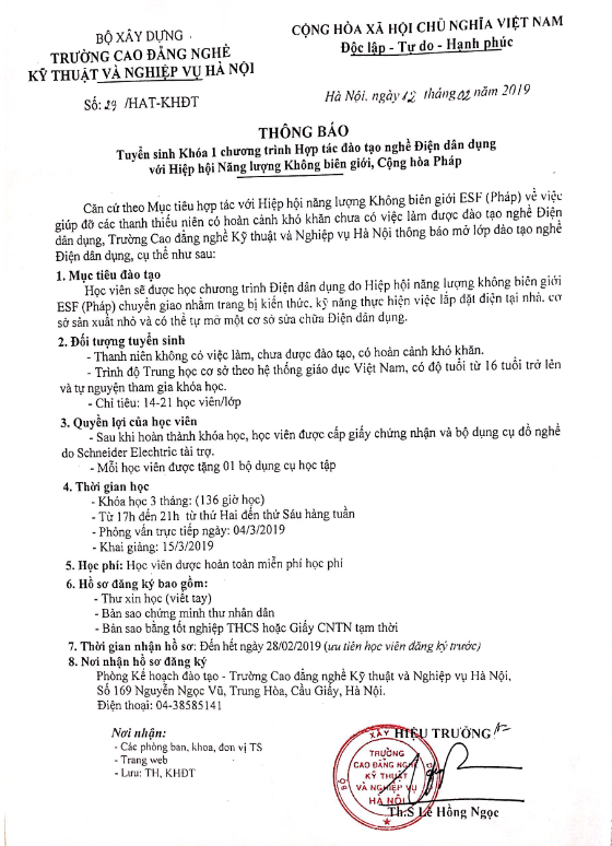 Tuyển sinh Khóa 1 chương trình Hợp tác đào tạo nghề điện dân dụng với Hiệp hội Năng lượng Không biên giới, Cộng hòa Pháp